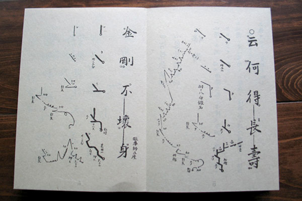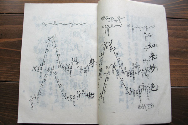 声明では楽譜のことを「博士(はかせ)」と言いますが、歌詞に音高(ピッチ)を示す記号(音譜)がついています。音の型、旋律型という一つのまとまった単位で覚え、それぞれの曲は旋律型の組み合わせでできています。また声の抑揚や長さを線で表し旋律が視覚化できるよう工夫されています。