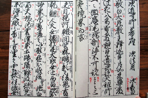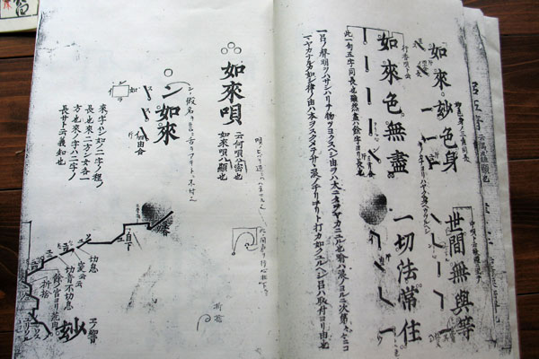 高野山では1472年に印刷楽譜が出版された後、1496年にそれを解説する教則本『魚山蠆芥集(ぎょさんたいがいしゅう)』が編纂されました。それらは今用いている本博士と基本的に同じです。ただ現在では、若い人にもわかり易いように博士をより視覚化した仮博士を用いて教えています。声明の最古の楽譜といわれている10世紀頃のものが、敦煌で発掘されイギリスの大英図書館に保存されていますが、つい最近、朝鮮の新羅に留学した僧侶が持ち帰ったという、8世紀頃の「ネウマ譜」という線で書かれた楽譜が発見され、博士の起源はさらに古くなりました。 - 声明はお師匠さんから教わる口頭伝承が基本ですが、合唱の訓練はしますか?