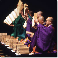 ところが当時の宗教界からは、「坊さんが劇場で観客に向かって歌うなんて何事か!仏様を冒涜している」といった批判も浴びました。その時、青木融光大僧正という我々の師匠は、「仏さまは宇宙に偏在していらっしゃる。寺の本堂だけにいるわけではなく、街頭でもどこでもあらゆるところにいらっしゃる。声明を本当に心から聞いてくれる人がいるところであれば、むしろ積極的に出かけていきましょう」と毅然として言われ、80歳をこえて外国公演にも出かけられました。我々はまだ20代でしたが、この青木融光という人間国宝でもあった師匠の存在が本当に大きかったと思います。